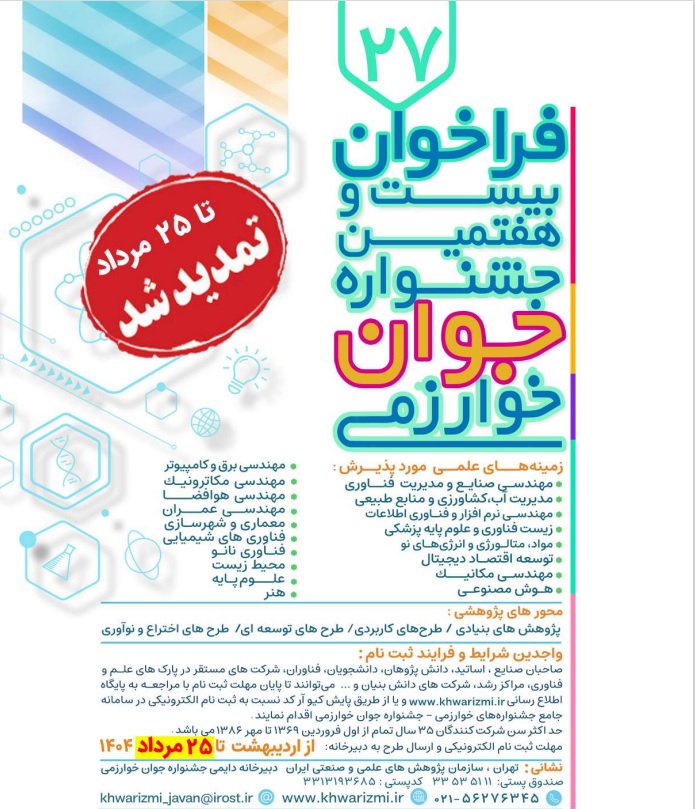 مهلت ثبت‌نام و تکمیل مستندات برای شرکت در بیست‌وهفتمین جشنواره جوان خوارزمی تا تاریخ ۲۵ مرداد ۱۴۰۴ تمدید شد و متقاضیان می‌توانند از طریق پایگاه اطلاع‌رسانی جشنواره‌های خوارزمی به نشانی www.khwarizmi.ir و در بخش سامانه جامع جشنواره‌های خوارزمی نسبت به ثبت‌نام اقدام کنند.