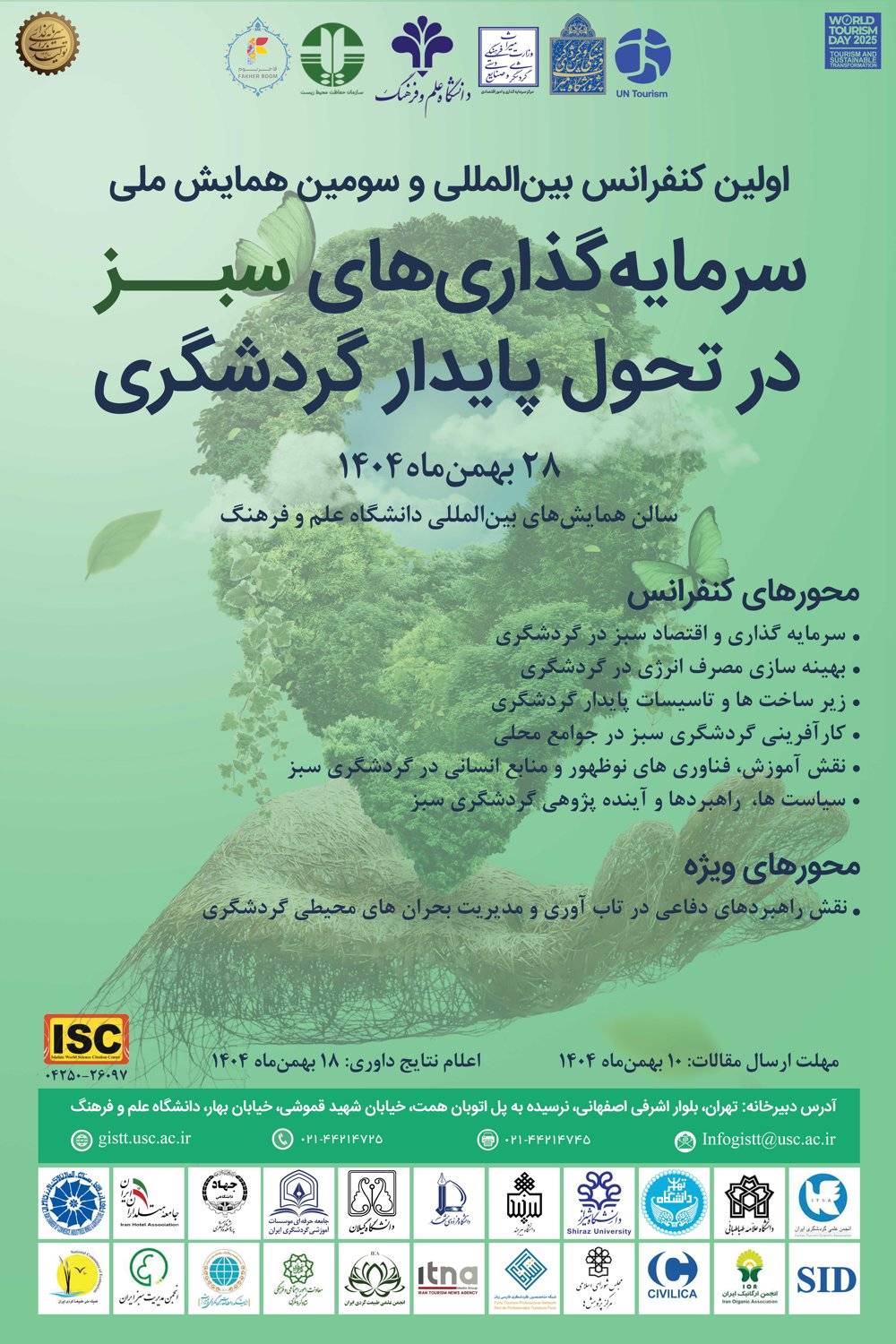 اولین کنفرانس بینالمللی و سومین همایش ملی «سرمایهگذاری سبز در تحول پایدار گردشگری» باهدف بررسی رویکردهای نوین سرمایهگذاری و پایداری در صنعت گردشگری، به میزبانی دانشگاه علم و فرهنگ در تاریخ ۲۸ بهمنماه ۱۴۰۴ برگزار خواهد شد.