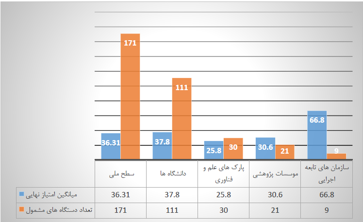 جزئیات امتیازات کل کشوری و تفکیک آن بر اساس نوع سازمانها (پارکهای علموفناوری، دانشگاهها و سازمانهای تابعه) در تصویر شماره ۲ قابلبررسی است.