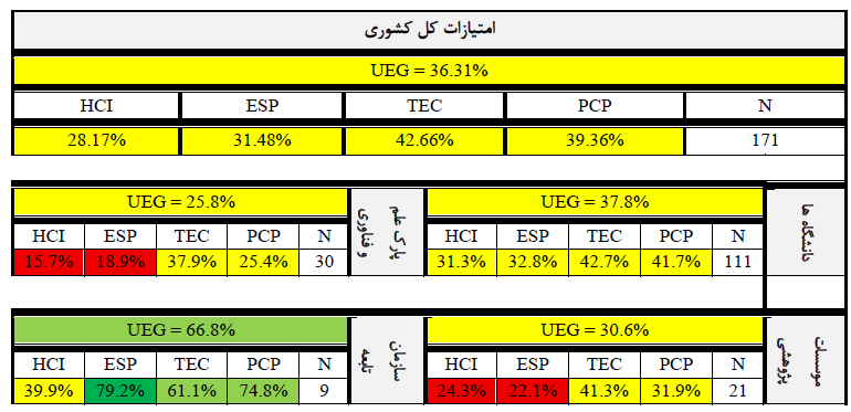 تصویر شماره ۲: امتیازات کل کشوری و تفکیک امتیازات بر اساس نوع مؤسسات (UEG=امتیاز کل) همچنین، نمودار مقایسهای زیر (تصویر شماره ۳) شکاف موجود میان عملکرد بخشهای مختلف را بهوضوح نشان میدهد. درحالیکه ۹ سازمان تابعه اجرایی با میانگین امتیاز ۶۶.۸ پیشتاز هستند، ۱۱۱ دانشگاه کشور با میانگین ۳۷.۸ در رده بعدی قرار دارند و پارکهای علموفناوری و مؤسسات پژوهشی نیازمند توجه بیشتری در این حوزه هستند.