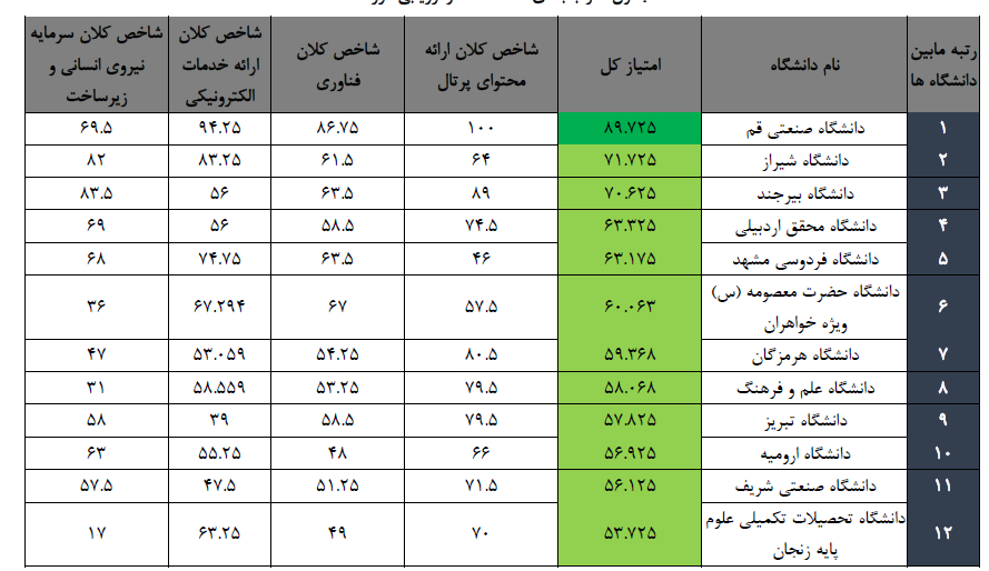 همانطور که در تصویر شماره ۱ (جدول رتبهبندی) مشخص است، دانشگاه علم و فرهنگ بهویژه در شاخص «ارائه محتوای پرتال» با کسب امتیاز ۷۹.۵ عملکردی درخشان داشته است.