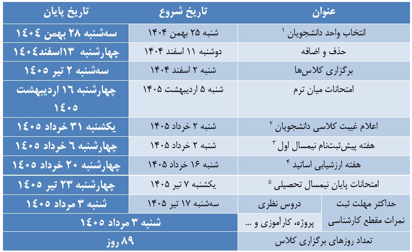 خلاصه تقویم آموزشی نیمسال دوم سال تحصیلی ۱۴۰۵- ۱۴۰۴