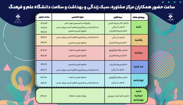 به اطلاع دانشجویان گرامی و اعضای محترم خانواده علم و فرهنگ میرساند، این مرکز مشاوره و سبک زندگی، بهداشت و سلامت بهمنظور کمک به ارتقای سلامت جسم و روان دانشجویان در مواجهه با چالشهای دوران دانشجویی و کارکنان راهاندازی شده است که خدمات روانشناختی، بهداشت روان، پزشکی و…در بر میگیرد.