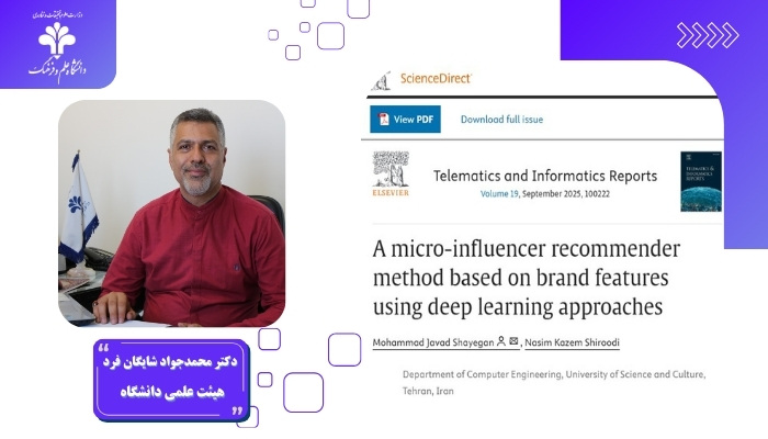 مقالهای با عنوان «یک روش پیشنهادگر مایکرواینفلوئنسر بر پایه ویژگیهای برند با استفاده از رویکردهای یادگیری عمیق» A micro-influencer recommender method based on brand features using deep learning approaches توسط دکتر محمدجواد شایگانفرد عضو هیئت علمی گروه مهندسی کامپیوتر دانشگاه علم و فرهنگ، در نشریه بینالمللی Telematics and Informatics Reports از انتشارات Elsevier منتشر شد.