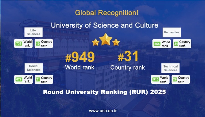 این رتبه‌بندی که توسط آژانس مستقل RUR Rankings Agency منتشر شده، عملکرد بیش از ۱۲۰۰ دانشگاه برتر جهان را بر پایهٔ چندین حوزه موضوعی شامل آموزش، پژوهش، تنوع بین‌المللی و پایداری مالی عملکرد در قالب ۲۰ شاخص مختلف بررسی و ارزیابی می‌کند. پس از اعلام نتایج رتبه‌بندی Round University Ranking (RUR) در اواخر بهار سال جاری که دانشگاه علم و فرهنگ در جایگاه ۳۱ ایران و ۹۴۹ جهانی قرار گرفت، در تازه‌ترین رتبه‌بندی اعلامی از سوی این آژانس در ماه اخیر نتیجه رتبه‌بندی موضوعی دانشگاه‌ها بر اساس ۴ حوزه موضوعی علوم زیستی، علوم اجتماعی، علوم‌انسانی و مهندسی اعلام شده است.